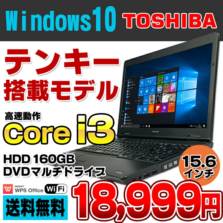 【中古】 東芝 dynabook Satellite シリーズ 15.6型ワイド ノートパソコン Corei3 メモリ2GB HDD160GB DVDマルチ 無線LAN テンキー Windows10 Home 64bit Kingsoft WPS Office付き